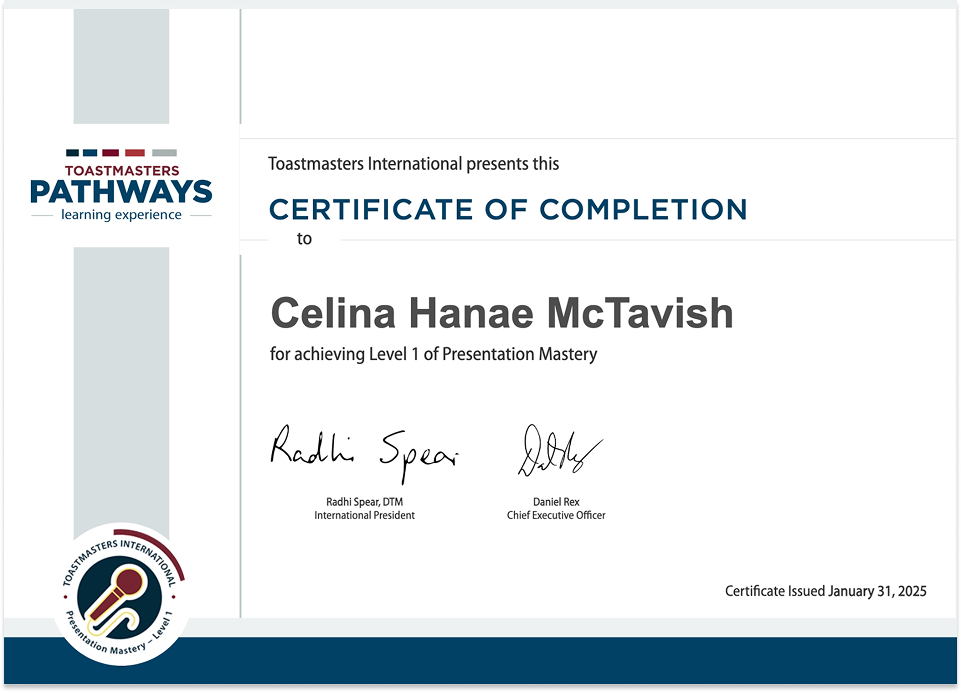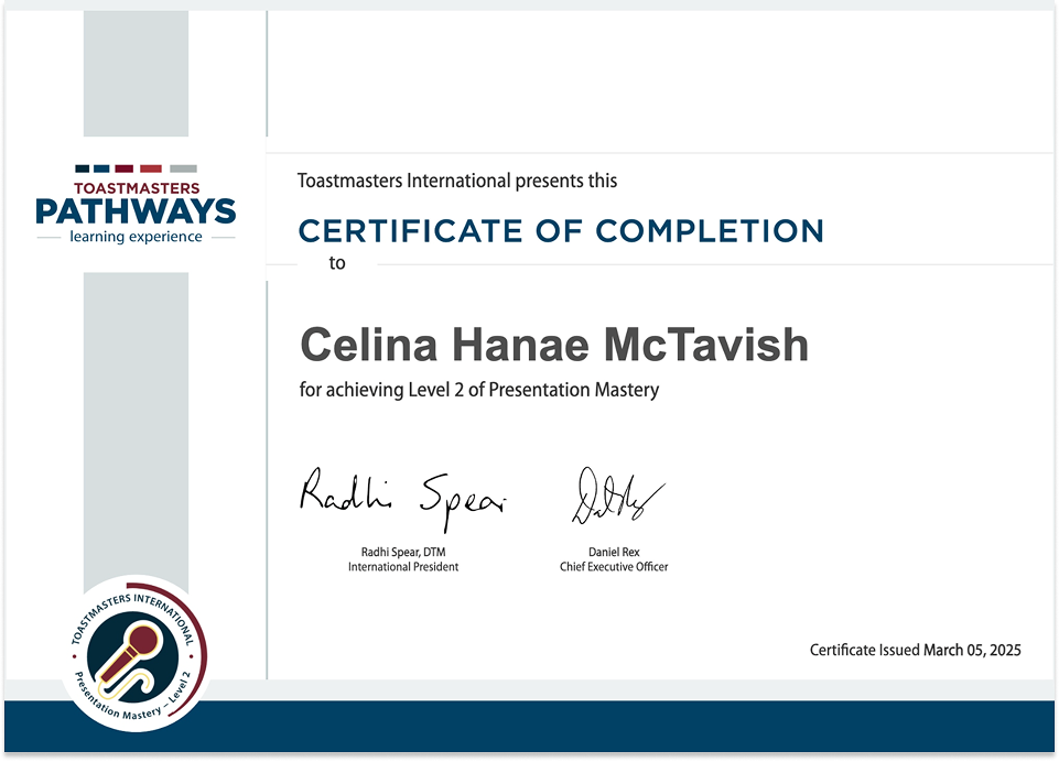 As part of my personal growth, I part take in the Toastmasters Pathway called Presentation Mastery where I need to take on specific speeches to practice different skills whilst presenting infront of a crowd. This pathway consists of a total of 5 levels, with a total of 42 speeches. I am currently in progress with level 3, consisting of 17 speeches to complete.