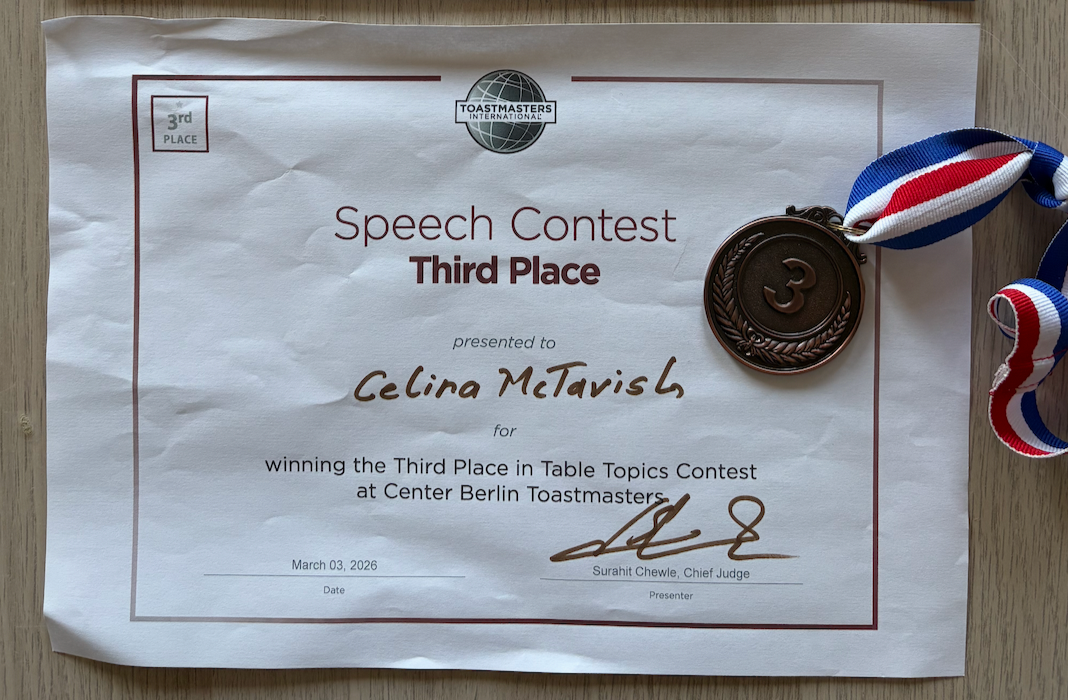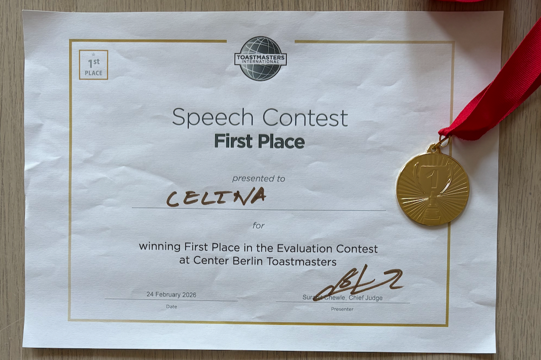 Toastmasters is a organisation focusing on practicing and improving public speaking. I have been an active member of the Center Berlin Toastmasters club since January 2024.
