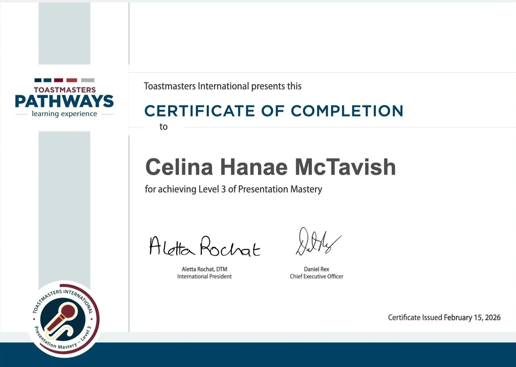 As part of my personal development, I participate in the Toastmasters Presentation Mastery Pathway, where I practice and develop public speaking skills through regular speeches delivered to a live audience. The program consists of five levels, and 15-16 speeches in total, and I am currently progressing through Level 4.
